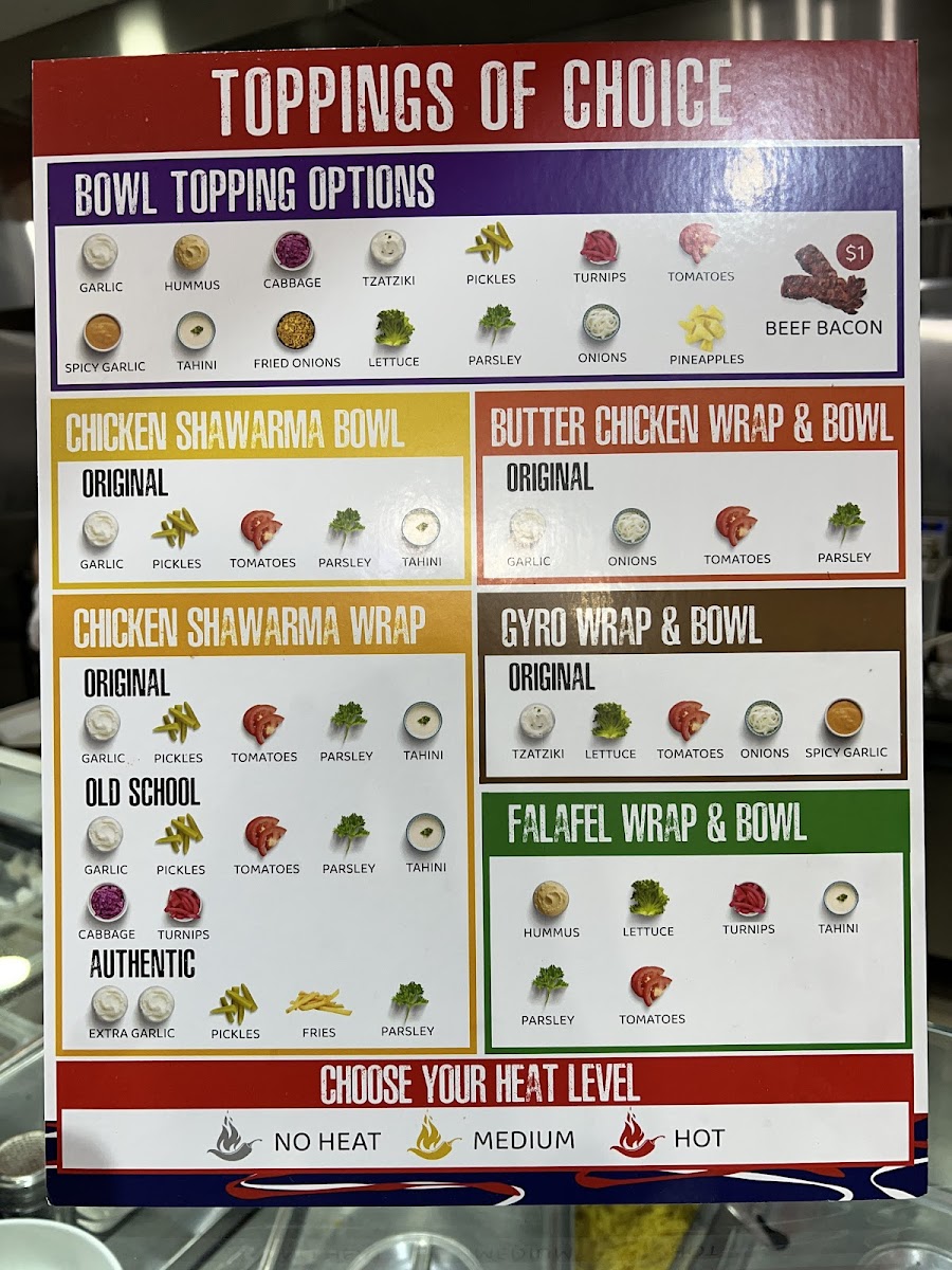 Enjoy delicious chicken shawarma piled on top of mouth-watering rice with your choice of 5 toppings.